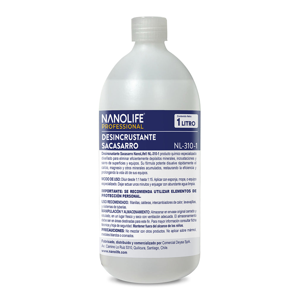 Desincrustante Sacasarro NanoLife® NL-310-0 producto químico especializado diseñado para eliminar eficientemente depósitos minerales, incrustaciones y sarro de superficies y equipos. Su fórmula potente disuelve rápidamente el calcio, magnesio y otros minerales acumulados, restaurando la eficiencia y prolongando la vida útil de sus equipos.